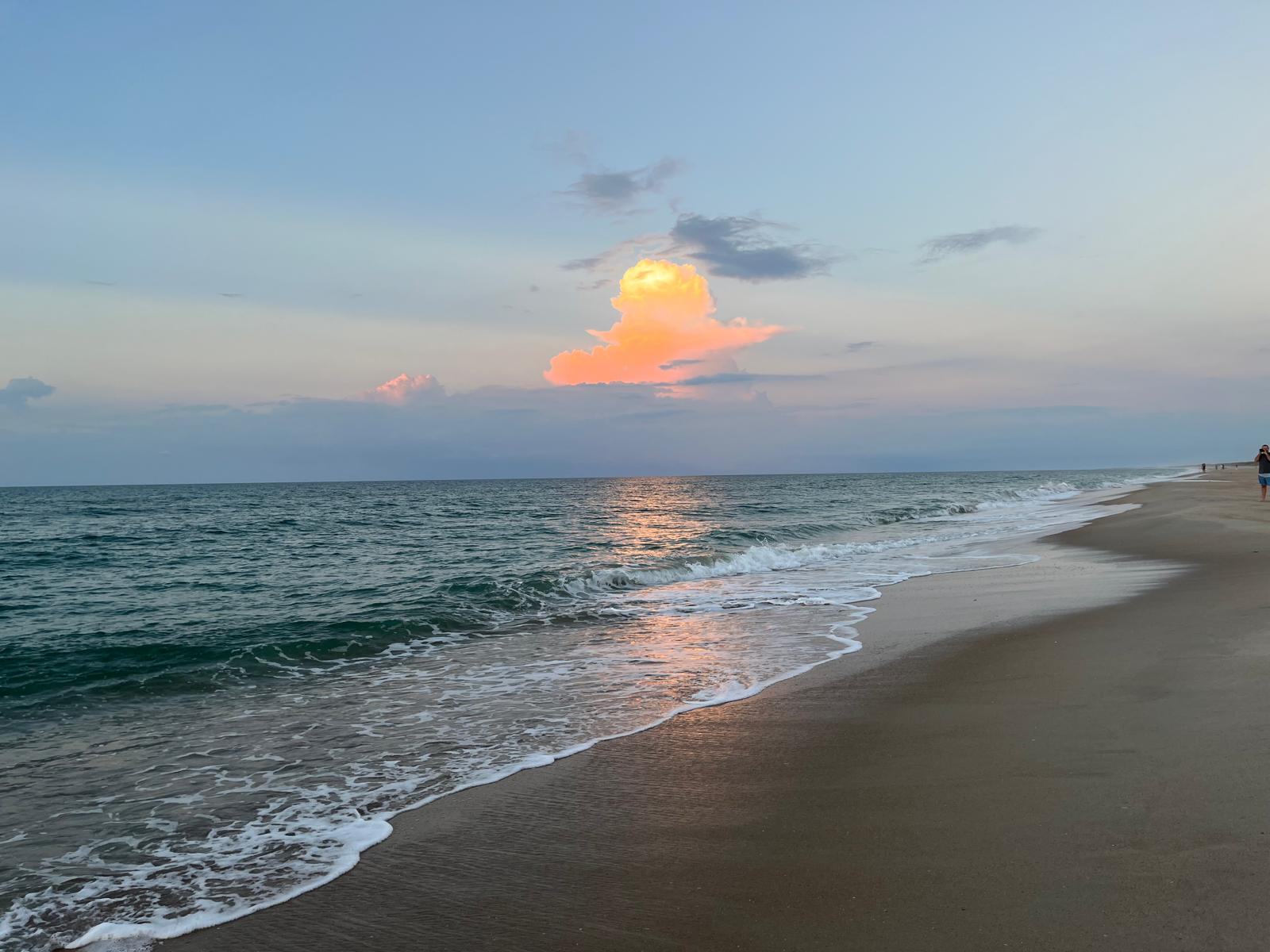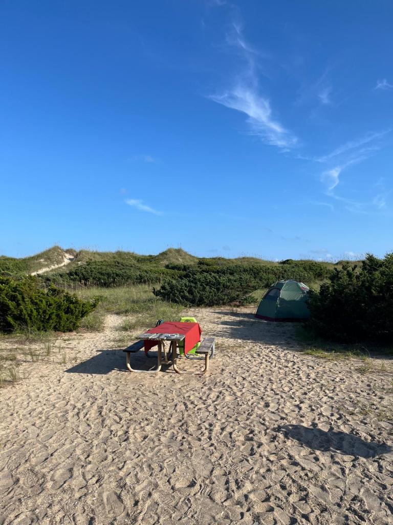 We pulled into the Ocracoke Campground, part of the Cape Hatteras National Seashore, after a nearly three hour ferry ride. Because it is a national campground, I am able to get a lifetime discount using my Access Pass that having Type 1 diabetes (T1D) makes me eligible for, and which can be obtained from the National Park System. (Now, we need guaranteed affordable access to life-sustaining insulin and supplies!) The land of the campground is sandy and windswept, with low vegetation and dark supple leaves that may be marsh-pennywort interspersed in the grass. When we arrived at our campsite, we immediately set to putting the space in order. Car camping brings a different level of luxury and offers the potential to really add style to your overnight home. On this trip, I brought my trusty big red tablecloth as both a cover for the picnic table and a beach-sitting surface area to protect against sand fleas. For the evening, it created an inviting setting for our dinner of cauliflower steaks, corn, and a pre-prepared curry tofu stir-fry, which we cooked/heated over charcoal. Easy dinner allowed us to maximize evening beach time. Beach camping is not very comfortable,* and the only place that seems to be reliably free of biting insects is right at the edge of the waves. When we crested the sand dunes, the light had softened, but the sun still illuminated the clear water so that we could see through each turquoise wave as they crashed into the sand. We both agreed that the water here was bluer and clearer than the rest of the Outer Banks, perhaps because of less dense shoreside development.