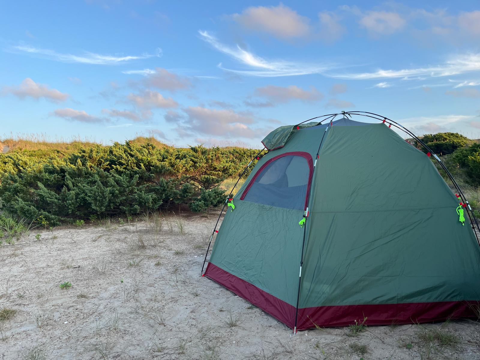 Grad school really interfered with my camping habit. In the two years before I started the program, I was on a camping spree, spending more than 25 nights outside. Now that I type this out, I realize that’s really not many – roughly 3.5% of the time. Maybe some year in the future I would like to spend 25% or more of the nights outside. But in any case, during the two years I was in my graduate program, that number dropped to 0. Luckily, this past weekend broke the dry spell and offered a night on Ocracoke Island, in the middle of parallel stands of juniper bushes, one dune away from the waves of the Atlantic Ocean. It was my first time camping with the Omnipod 5 system, and like nearly everything with the Omnipod system has been for me, it felt easier. Learning from the trip I wrote about in my previous post, I packed an anti-nausea medication prescribed by my doctor and familiarized myself with the location of the island medical center. I also brought an external power brick to make sure I could keep my phone, which I use as my CGM reader, and my Omnipod personal diabetes manager (PDM) charged. The only thing I remained concerned about was the chance that my medication would get too hot in the late August sun, or that my pod or CGM would work its way off in the salty water.